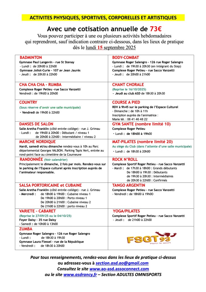 Créée en 1997 au sein de lβAS Drancy, la section ADULTES OMNISPORTS accueille les adultes de +25 ans.